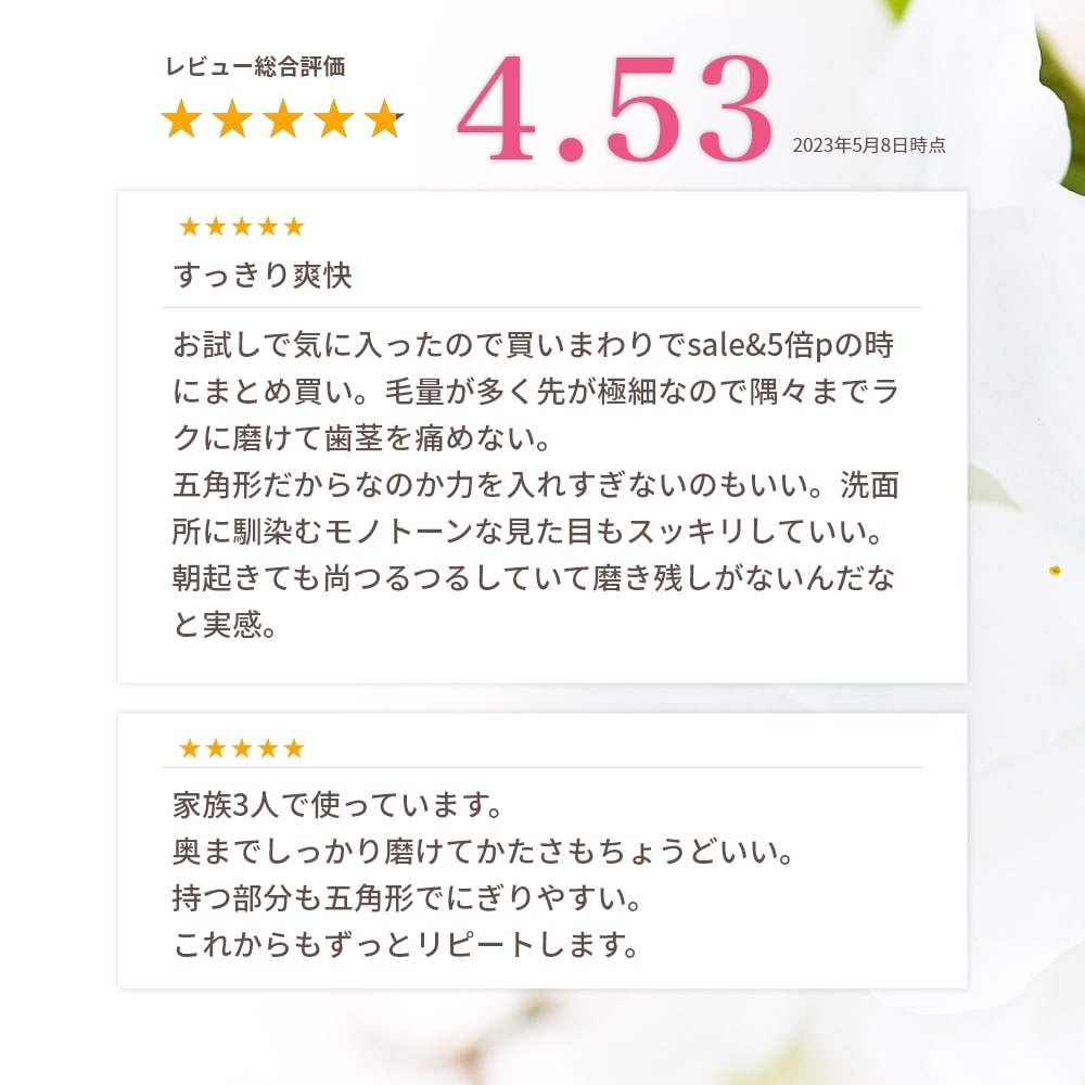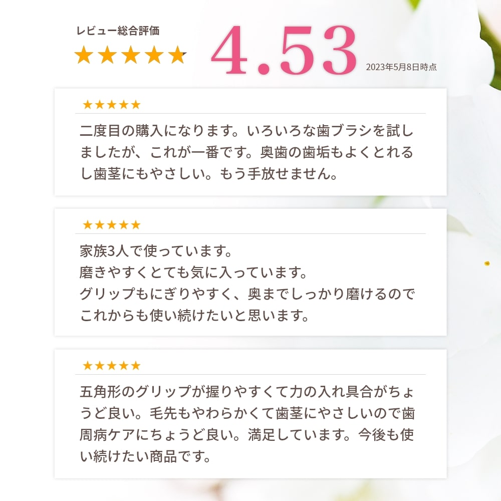 ピンクは先丸加工をしっかりと行い、歯と歯ぐきをやさしく磨き上げます。