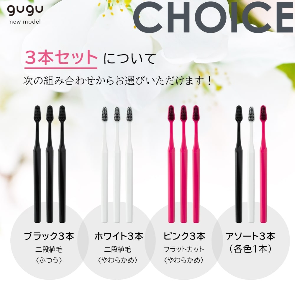 | 3本セットについて | ブラック3本orホワイト3本orピンク3本orアソート(各色1本)3本のどちららかをお選びいただけます。 |
