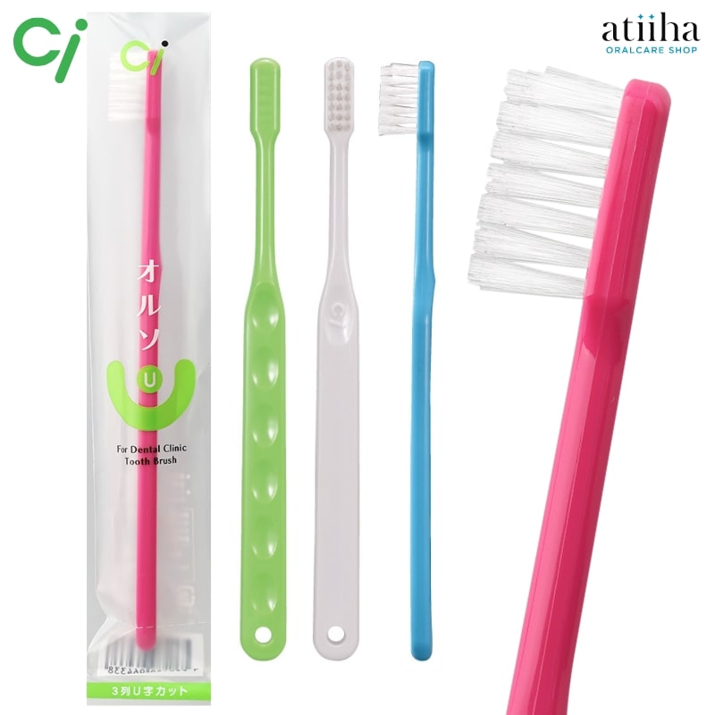 ブラシセンターの凹部にブラケットワイヤーを当て、両端で歯面を清掃。