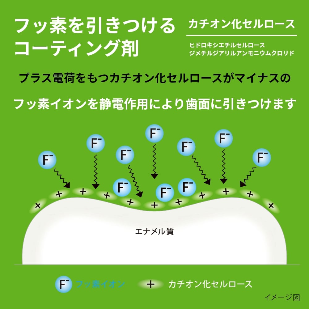 | 成分表記 | 湿潤剤(ソルビット液、PG)、清掃剤(無水ケイサンA)、香味剤(香料(マイルドピュアミントタイプ)、キシリトール、サッカリンナトリウム)、粘度調整剤(無水ケイ酸)、粘結剤(キサンタンガム、ポリアクリル酸ナトリウム)、発泡剤(ヤシ油脂肪酸アミドプロピルベタイン液、ラウリル硫酸ナトリウム)、安定剤(酸化Ti)、薬用成分(フッ化ナトリウム)、保存料(パラベン)、コーティング剤(ヒドロキシエチルセルロースジメチルジアリルアンモニウムクロリド) |